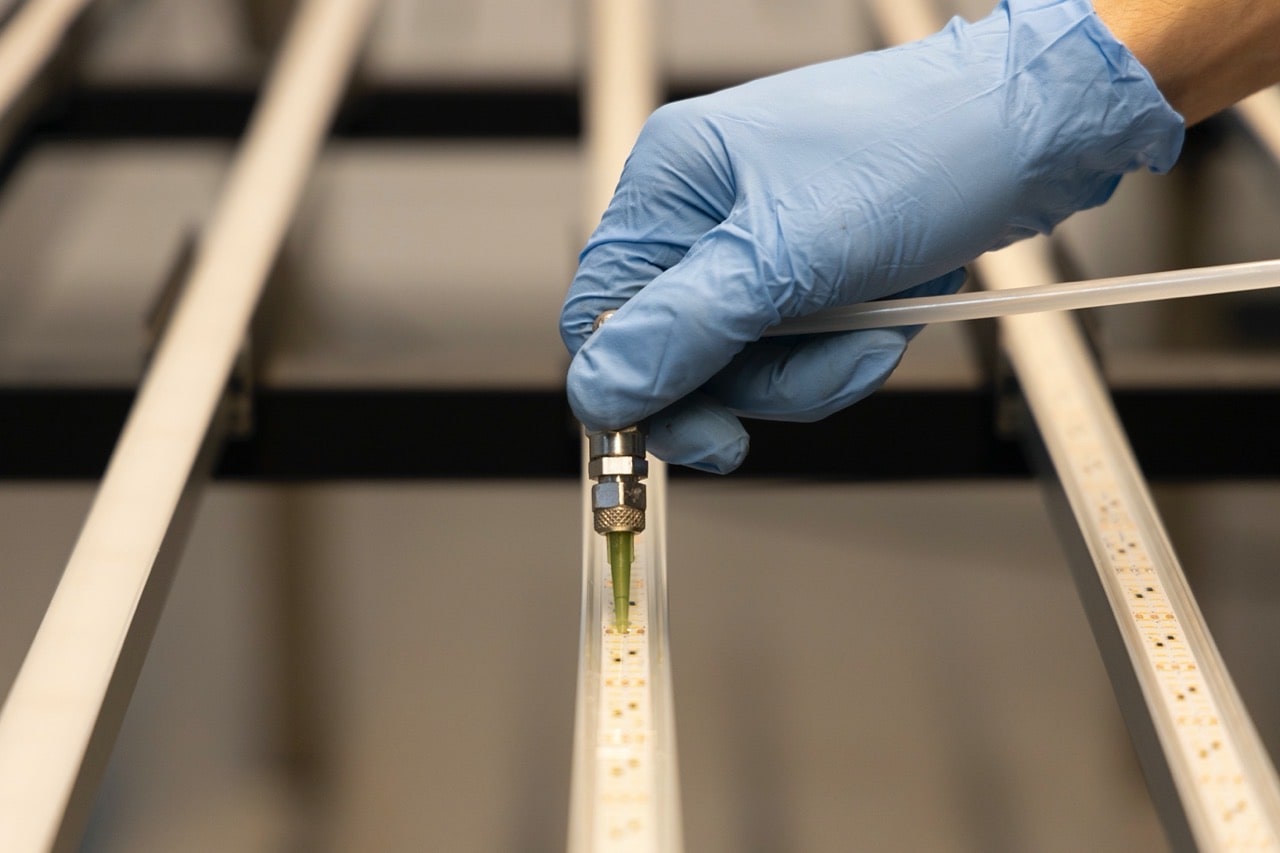 La resina che viene utilizzata nelle applicazioni industriali, più propriamente chiamata resina artificiale o resina sintetica, è una miscela di materiale viscoso composta da una serie di polimeri, che si possono ottenere da una grande varietà di materie prime, con la capacità di indurirsi e di solidificarsi, a freddo e a caldo. La resina può essere di diverse tipologie, tra cui quella poliuretanica, l’epossidica, la fenolica, l’acrilica. Essa, una volta solidificata, viene utilizzata come sigillante ed elemento di protezione da polveri, umidità ed agenti esterni. A seconda del tipo di resina utilizzata, si può ottenere fino ad un grado di protezione elettrica IP68. I principali settori di applicazione della resinatura industriale di cui l’Azienda si occupa sono l’elettronica, l’illuminotecnica e l’elettromedicale.